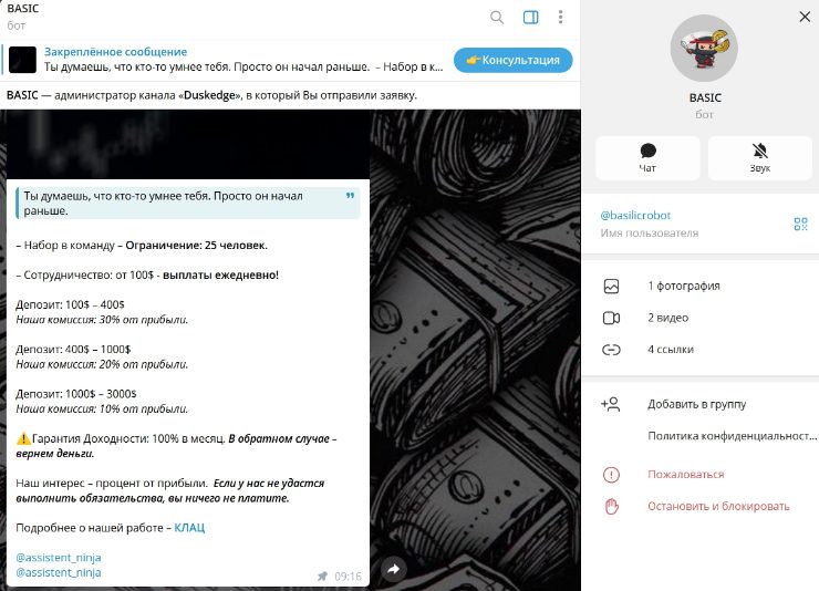 Детали предлагают уточнять в личной переписке с администраторами Basilic Bot, то есть условия фиксируются не документами, а сообщениями в Telegram. Отдельный риск в том, что инвестору не дают прозрачного контроля над торговым счетом. Фактически человеку предлагают передать деньги частным лицам, ориентируясь на обещания и «гарантии» без подтвержденной статистики.