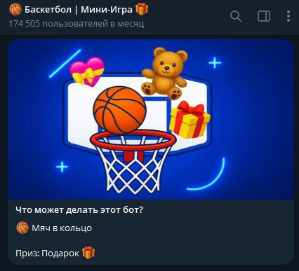 Суть Basketball Gift Bot простая: бот отправляет эмодзи баскетбольного мяча и кольца, а результат каждого броска определяется случайно. За попадания создатели обещают «крутой подарок», но какой именно подарок и при каких условиях его можно получить, нигде не указано.