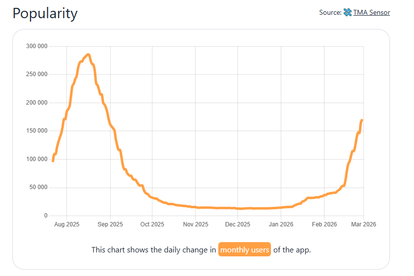 По данным Телеграмм на март 2026 года, ботом ежемесячно пользуются 174 500 человек, но на графике активности видны резкие скачки и падения, характерные для накрученных показателей.