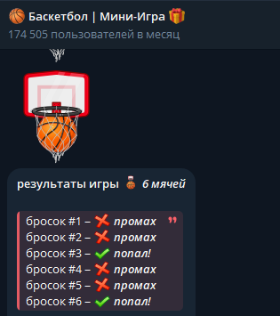При тестировании Basketball Gift Bot из 6 бесплатных бросков только 2 оказались попаданиями, а 4 ушли в промах.