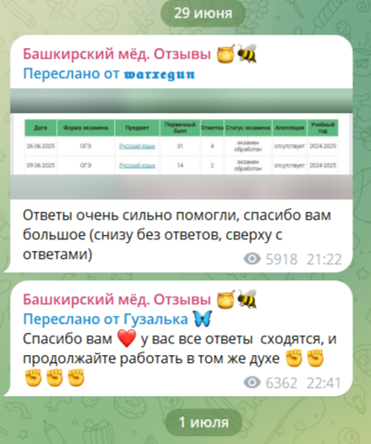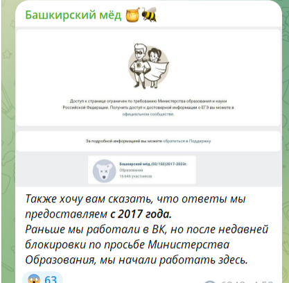 Сообщество «Башкирский мед» в ТГ постоянно расширяет сферу влияния. Авторы уже не ограничиваются ЕГЭ. Теперь публикуются ответы на четвертные контрольные, экзаменационные материалы для переходных классов и, даже, готовые задания на всероссийские олимпиады.