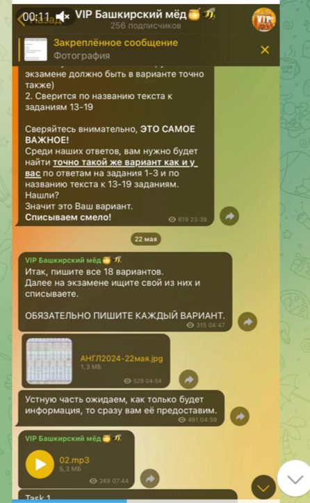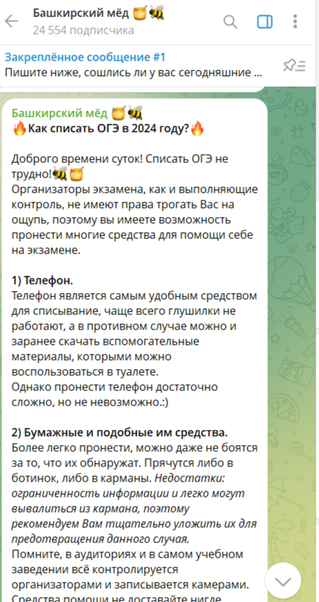 ТГК «Башкирский мед» создан весной 2022. При этом первый пост появился только через полтора года. В нем автор рассказывает об информационной составляющей проекта. Он обещает, что здесь будут оперативно публиковаться все варианты ответов на ЕГЭ. Дополнительно выходят «обучающие» материалы: как списывать на экзамене, правильно создавать шпаргалки и проносить телефон в аудиторию.