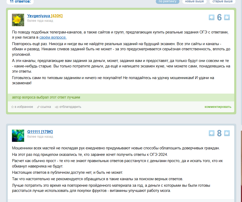 На сторонних ресурсах отзывов именно об этом канале нет. В некоторых тематических сообществах школьники время от времени интересуются, реально ли получить ответы на ЕГЭ в таких каналах. Взрослая аудитория подробно объясняет, что это происки мошенников. Сведения о предстоящих экзаменах тщательно охраняются и получить к ним доступ нереально. Все, что могут предложить такие каналы – это алгоритмы решения и варианты прошлых лет.