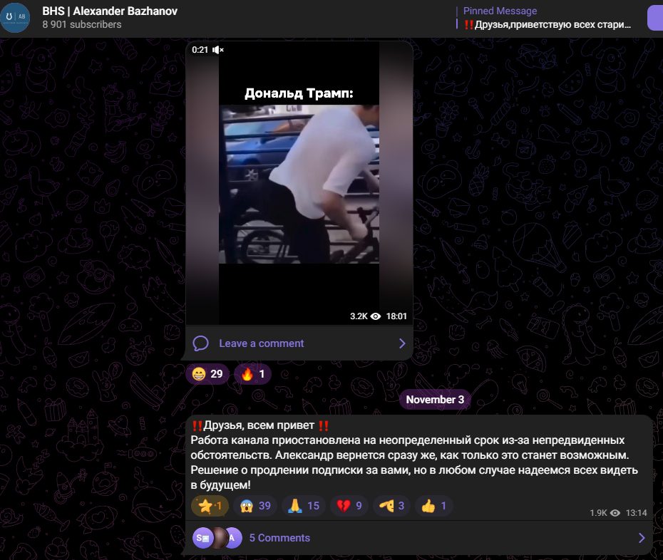 - С ноября месяца посты в канале не обновляются, и услуга закрытого клуба приостановлена, так как Александр не может в настоящее время выходить на связь, подробности не озвучиваются.