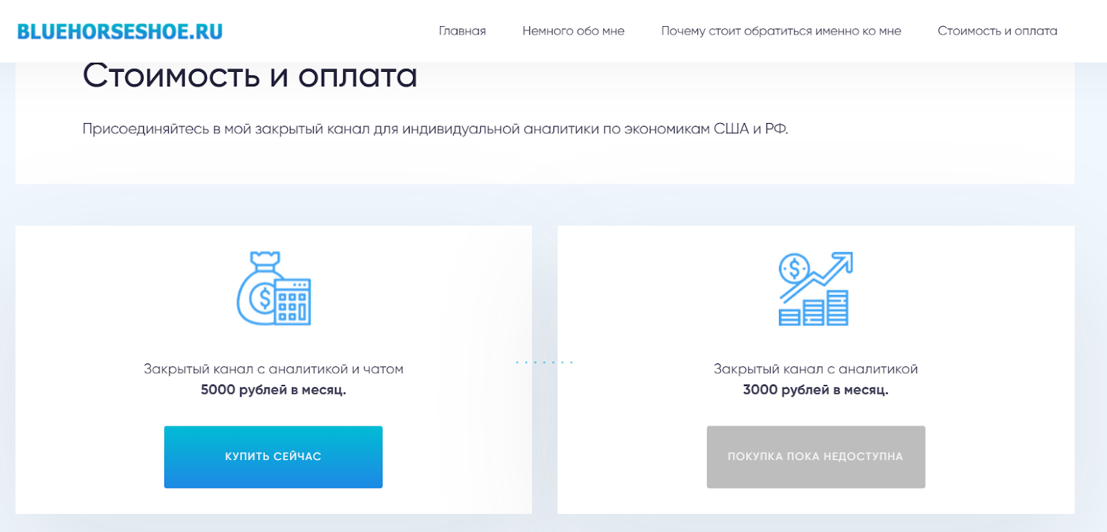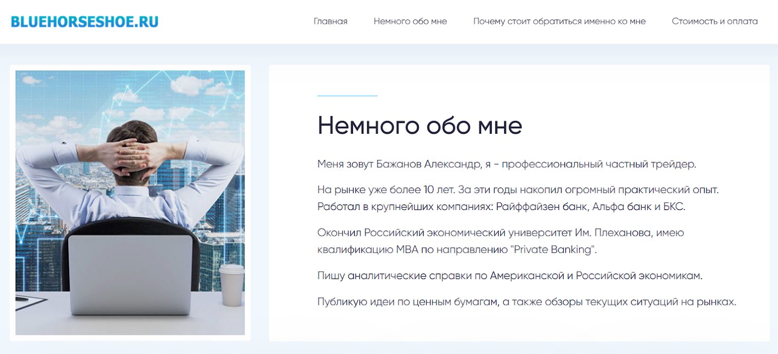 Телеграмм канал инвестора Бажанова Александра Евгеньевича создан в 2019 году. На момент написания обзора на него подписано почти 9000 человек, около 20% подписчиков читает посты регулярно. Комментарии открыты, однако не все публикации собирают обратную связь, негатива в сообщениях аудитории нет. О себе автор рассказывает следующее: он является профессиональным частным трейдером и уже более 10 лет зарабатывает на фондовом рынке. В его карьере были должности в Райффайзен банке, Альфа банке и БКС. Экономическое образование получено в университете имени Плеханова. Также есть квалификация МБА по направлению Private Banking. Бажанов является автором аналитики по американской и российской экономике. В своем канале bluehorsesh0e публикует новости и идеи по ценным бумагам, индексам, дает обзоры экономических, политических ситуаций и рассматривает западные и российские рынки.