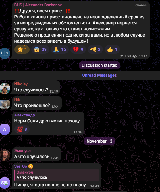 Последняя публикация в сообществе инвестора Бажанова Александра вышла 3 ноября. В ней сказано, что работа канала будет приостановлена на неопределенный срок. В комментариях пользователи обсуждают, что Александр отметил свой день рождения с непредвиденными последствиями, в связи с чем пока не может выходить в эфир и заниматься своими обязанностями. Тем, кто оплачивал подписку, рекомендовано связаться с администратором jordanbelfort31 для возмещения средств, либо ожидать возвращения трейдера для того, чтобы получить оплаченную услугу.