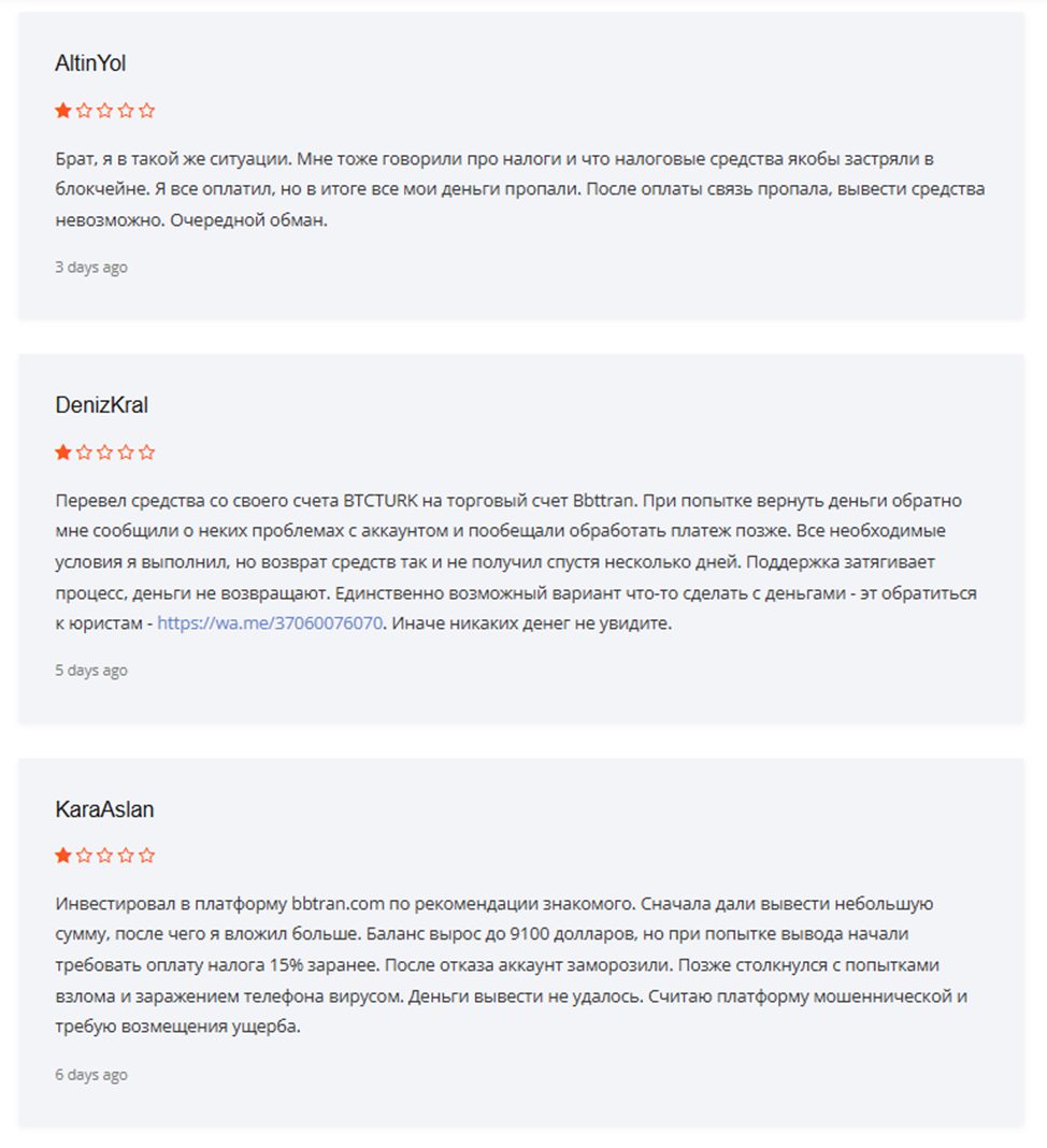 - множество негативных отзывов, подробно излагающих схему развода Bbttran Com Fraud.