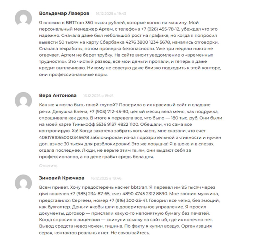 Мы не рекомендуем пользоваться услугами мошеннической платформы «Ббттран». Убедительные рассказы о своей деятельности на просторах интернета с отсылкой на международных консультантов не более, чем хорошо подготовленная реклама от организованной сети преступников. Инвесторы не только не могут вернуть деньги, но их еще пытаются развести на комиссии, налоги, страховки и прочие выдуманные сборы вроде: «15% налог на криптоактив», «платы за инженерные работы по восстановлению денег, застрявших в блокчейне» или «сбор на восстановление поврежденного канала вывода средств».