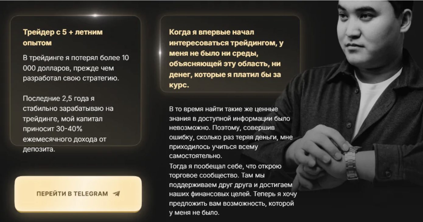 Есть также приветственный бот для новичков и личный профиль для связи. Кроме того, Бекнард продвигает наставничество через одностраничный сайт vibetradefx.com, где повторяется информация о сигналах и дается ссылка на канал. На март 2026 года сайт работает плохо: он почти не загружается, верстка на нем явно «слетела».