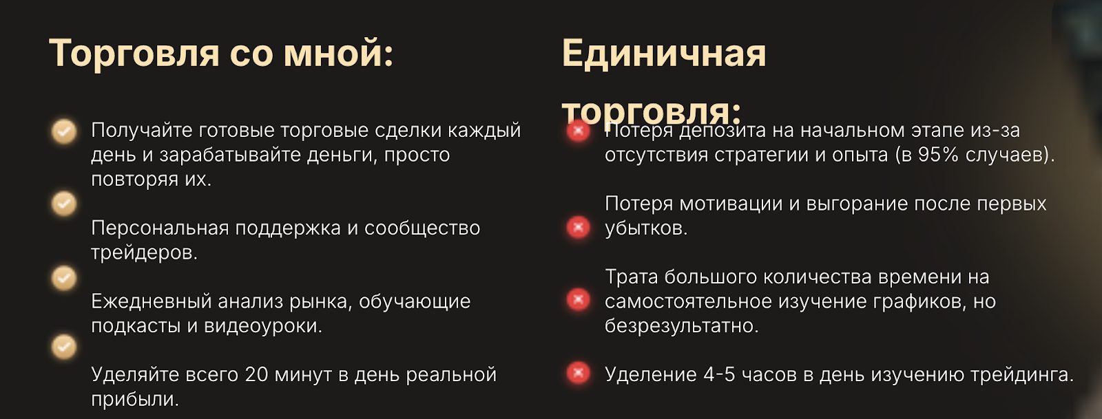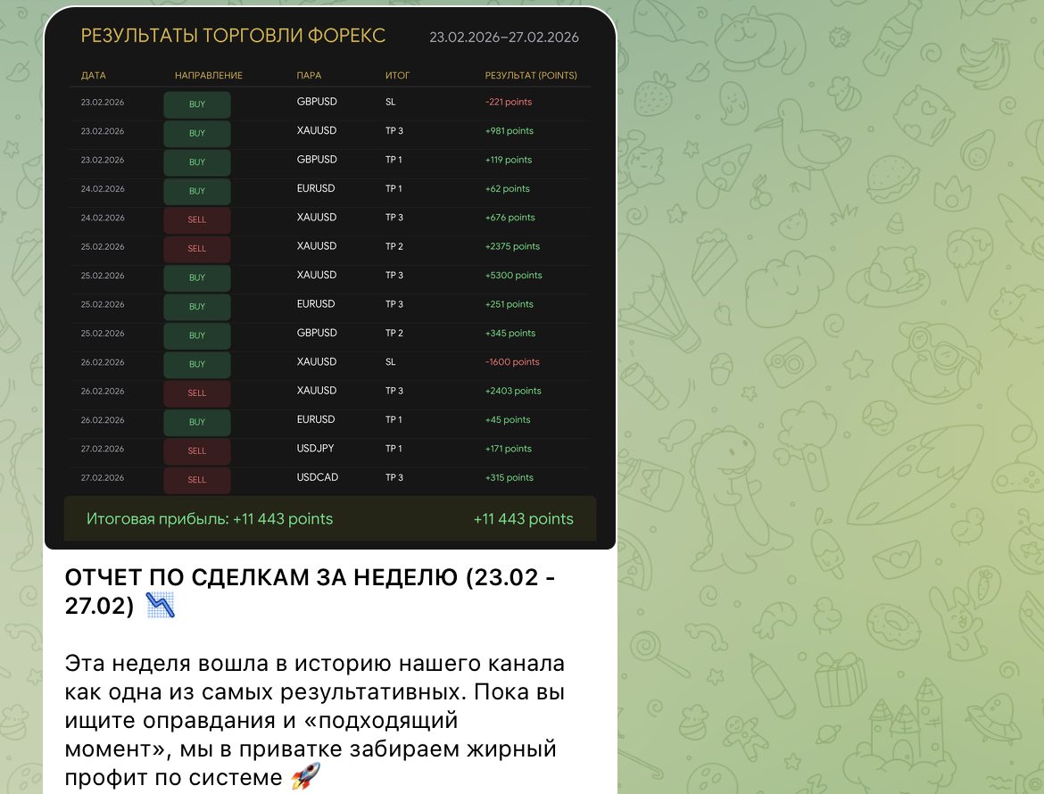 В открытом доступе публикуются примеры успешных сделок, скриншоты результатов и общие советы, но полная картина открывается только в закрытой группе. Там можно получить ежедневные сигналы, разборы рынка и даже личную поддержку.