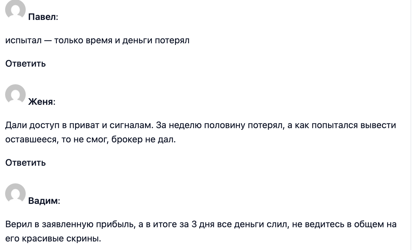 Негативный фидбек по каналу уже есть, несмотря на его «молодой» возраст. Пользователи пишут, что развод начинается с фейковых скринов, обещаний огромного профита на стабильной основе и продажи доступа в ВИП-чат. После входа в закрытую группу и начала торговли за несколько дней или максимум неделю депозит серьезно проседает — от 30–50% до полного слива. Люди отмечают, что сигналы приходят часто, но их точность далека от заявленной, а убыточные сделки идут целыми сериями. Причину «сливов» депозитов на канале Бекнард никому не объясняет.