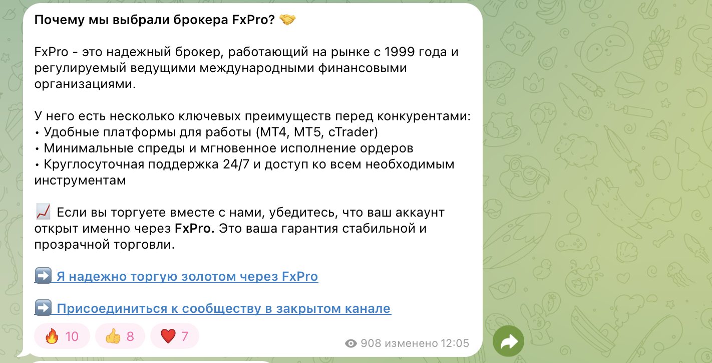 Далее Бекнард сразу устанавливает условие: чтобы зарабатывать, регистрируйтесь по рефералке на FxPro, иначе доступа не будет. Объясняется это «надежностью» и «прозрачностью» именно этого брокера, хотя на деле это его главная монетизация. Админ получает процент с каждого объема торгов — ему все равно, каким будет итог вашей сессии. Поэтому сигналы сыплются часто, по несколько раз в день.