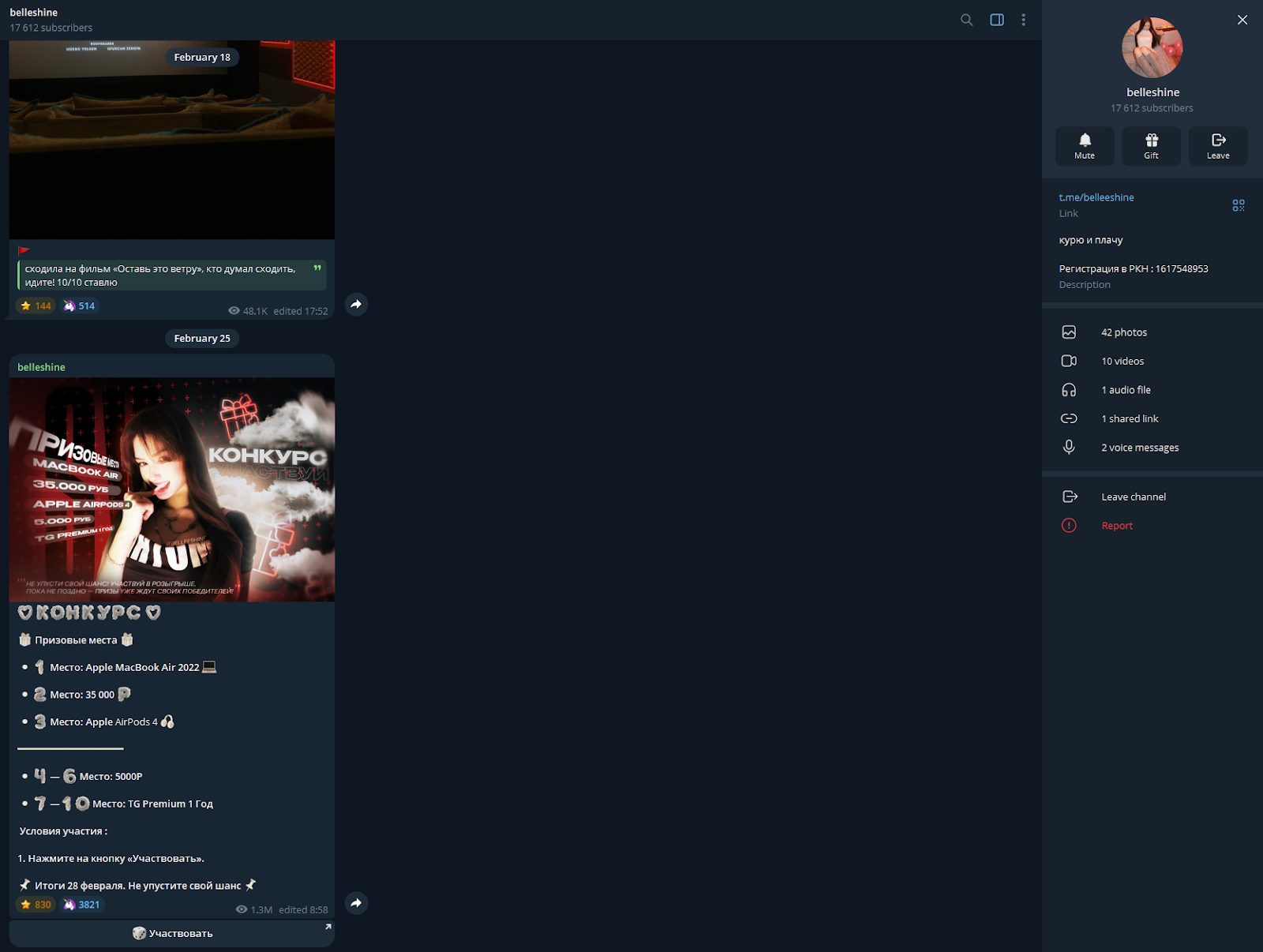 Пользователь BelleShineDm является основателем тг-канала BelleSh, который позиционируется как личный блог с регулярными розыгрышами ноутбуков, гаджетов и денег. В этом обзоре мы разберемся, как устроен паблик, какие механики используются для гивов и как администратор выстраивает общение. Выясним, какие нюансы могут возникнуть при сотрудничестве, как распределяются призы и стоит ли участвовать.