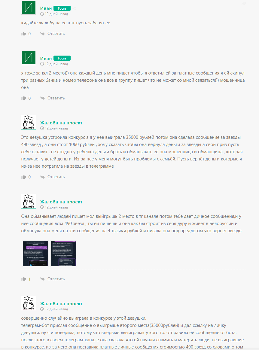 Пользователи сообщают, что пишут автору после получения второго или третьего места в розыгрыше, а в результате получают ответ вроде «открою личку позже» или «компенсирую звезды». Некоторые заявляют, что администратор игнорирует обращения, из-за чего люди теряют от ₽800 за отправленное сообщение.