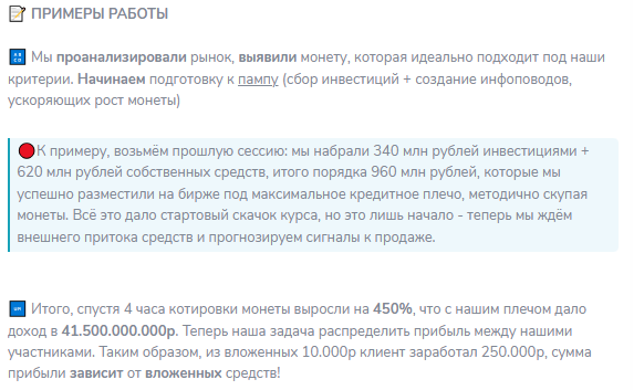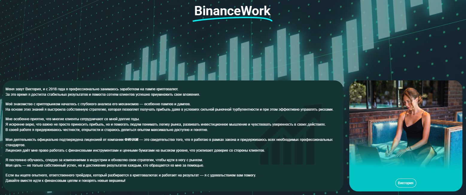 Автор представляется опытным трейдером с 2018 года. На сайте binancework ru написано о работе с пампом криптовалют. Покупает дешево, продает дорого. Заявляет, что помогла сотням людей получить прибыль от инвестиций.