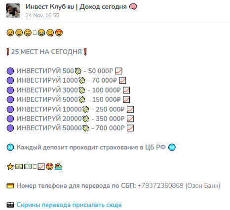 Постоянно демонстрируется страхование депозитов через ЦБ РФ. Документов об этом нет. В постах много эмодзи и искусственной срочности – «осталось 5 мест», «последнее место». Классическая система давления на психику. Базовые приемы манипуляции.