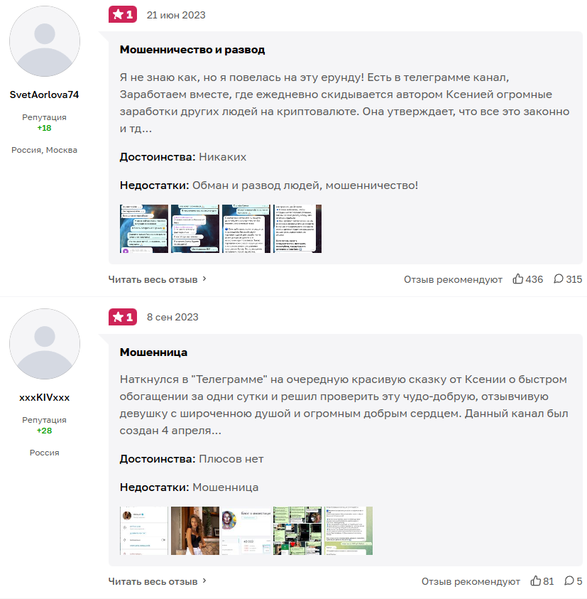 На otzovik ru опубликовано более 100 комментариев о похожих каналах. Все отрицательные. Ни одного положительного впечатления от инвестиционной деятельности. Отзывы о криптовалюте Белоусовой Виктории Леонидовне показывают всю правду.