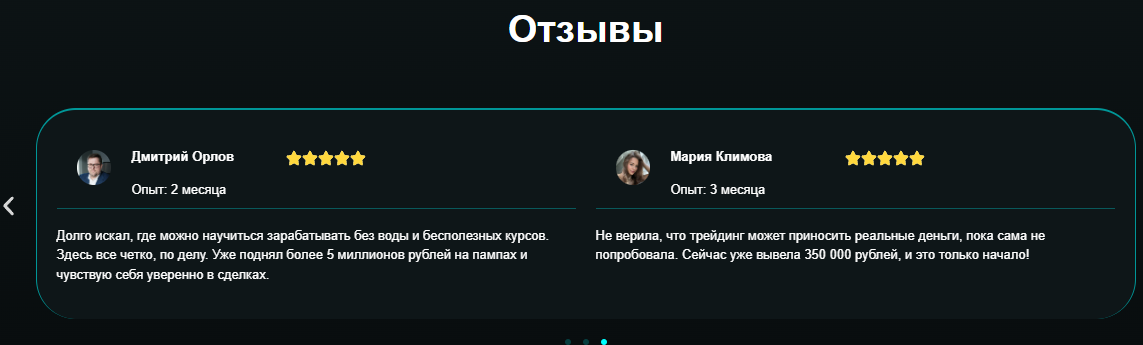 На сайте размещены восторженные отзывы об ИП Белоусовой Виктории Леонидовне. Дмитрий Орлов якобы заработал 5 миллионов за 2 месяца. Мария Климова вывела 350 000 за 3 месяца. Такое количество похвал вызывает подозрения.
