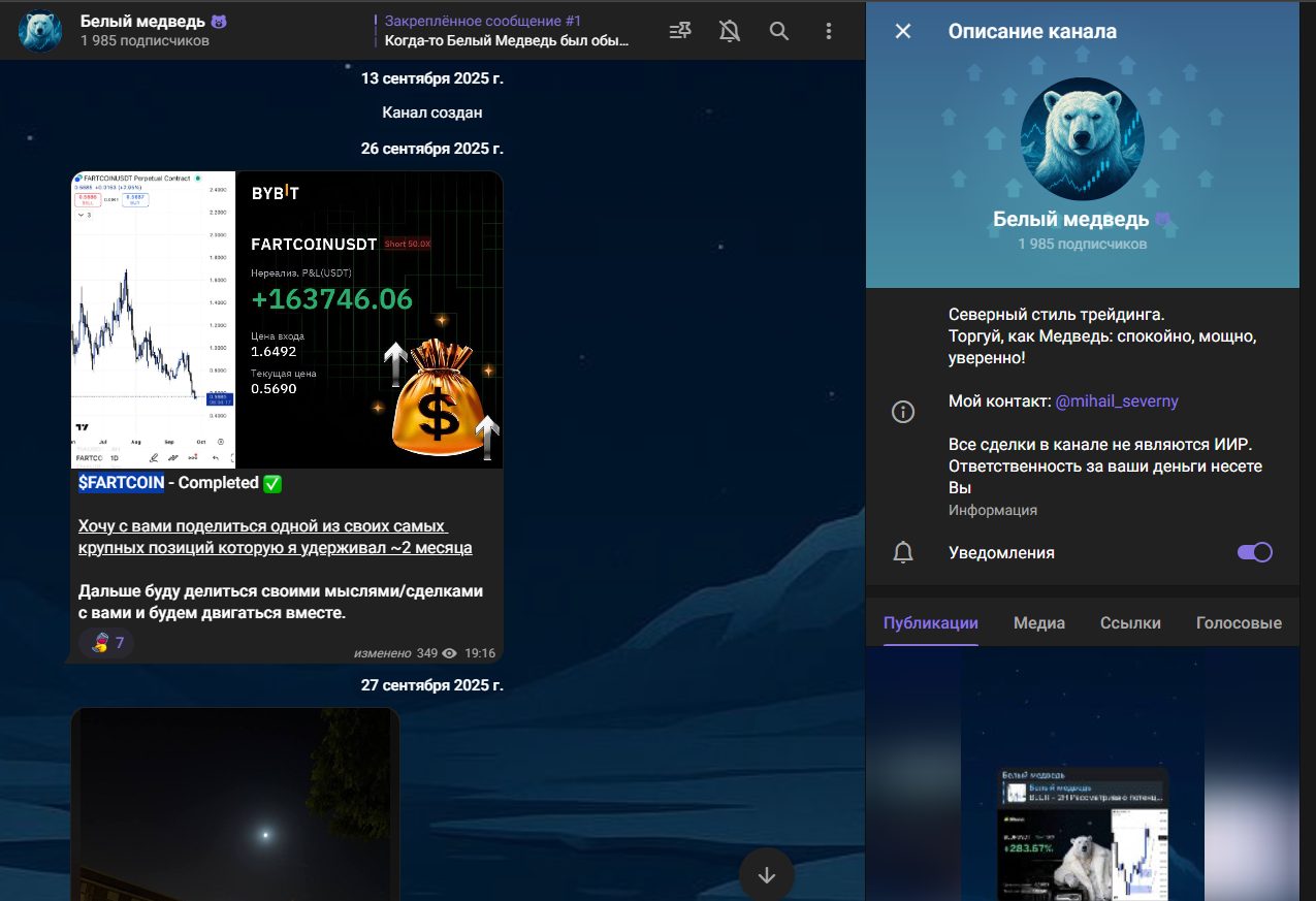 Сам тг-канал «Белый медведь» появился в мессенджере 13 сентября 2025 года. Админ не оставляет приветственного поста со своей лицензией или достоверной статистикой на биржах. Первая публикация демонстрирует график стоимости $FARTCOIN и скрин якобы профитной сделки с этим активом.