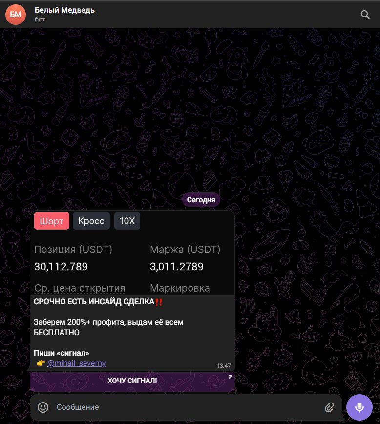 При подаче заявки на вступление в мессенджере активируется бот, который предлагает якобы срочную инсайд-сделку. Автор обещает 200% профита бесплатно, но чтобы получить сигнал, необходимо написать в личные сообщения к Михаилу Северному.