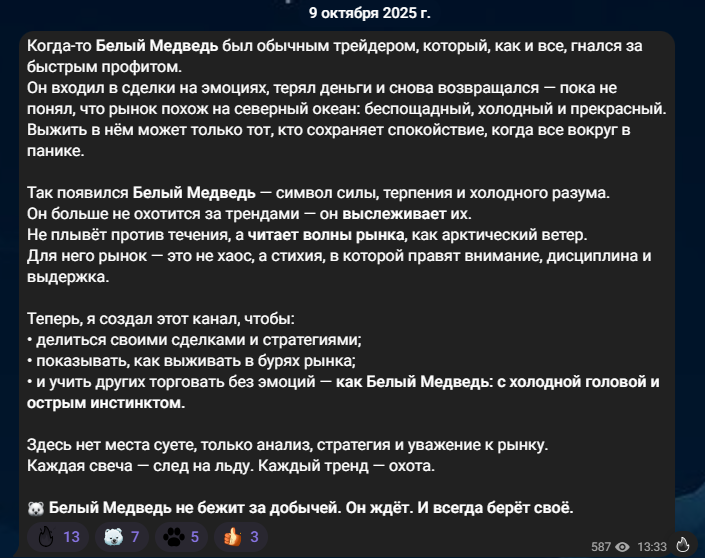 Закрепленный пост от 9 октября 2025 года объясняет, откуда взялось название телеграмм-канала. В нем автор сравнивает свою систему торговли с жизненными повадками хищника. Белый медведь в дикой природе является олицетворением силы, терпения и холодного разума. Для админа же, нашедшего в своем характере сходства с хищником, финансовый рынок – не хаос, а «стихия, в которой правят внимание, дисциплина и выдержка». В телеграмм-канале инвестор обещает: