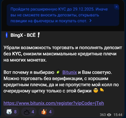 В одном из закрепленных постов трейдер оставляет реферальную ссылку для регистрации на бирже Bitunix. Остальные посты тг-канала «Белый медведь» демонстрируют не верифицированную статистику по сделкам с призывом вступить в закрытый клуб. Условия присоединения к VIP не раскрыты, за подробностями необходимо обращаться в личные сообщения. Вероятно, что настоящая стоимость подписки покажется кому-то неоправданно завышенной.