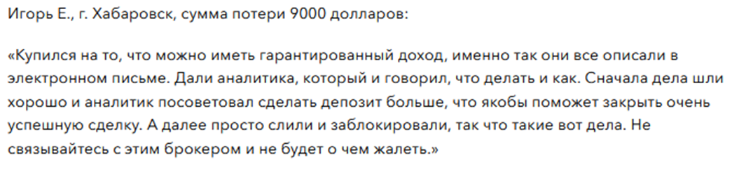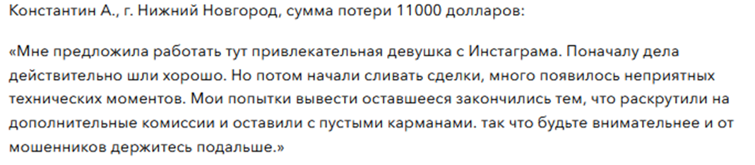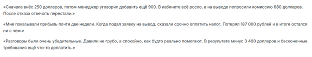 Часто требования включают в себя неясные комиссии, хотя при регистрации их не было. Сами менеджеры делают все, чтобы клиент внес больший депозит. Но сделки по их советам быстро сливаются, пользователь начинает торговать в убыток. Техподдержка постепенно перестает отвечать, счета блокируют.