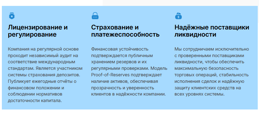 Площадка о себе дает крайне скудную информацию. Преимущества стандартные, заявлено о лицензировании, страховании и ликвидности. Клиентам говорят о регулярных аудитах и соответствии международным стандартам. Но развернутой информации нет, ссылки на результаты проверок отсутствуют, документация отсутствует.