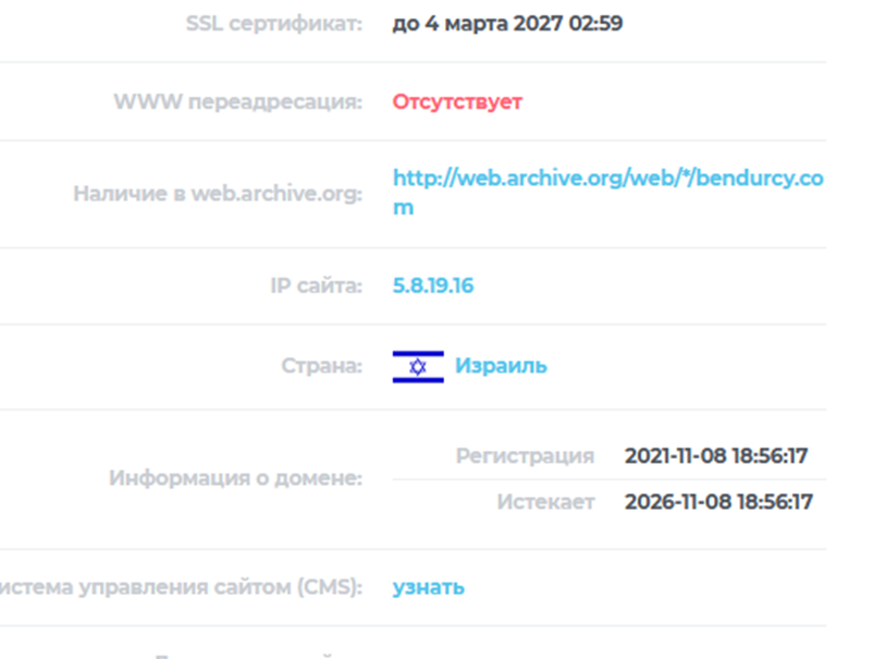 Точная дата и страна регистрации сайта неизвестны. Но по данным мониторингов удалось выяснить, что домен начал работу еще в 2021 году через израильский IP. 8 ноября 2026 года его срок истекает. Архивные данные скрыты, проверка активности невозможна.