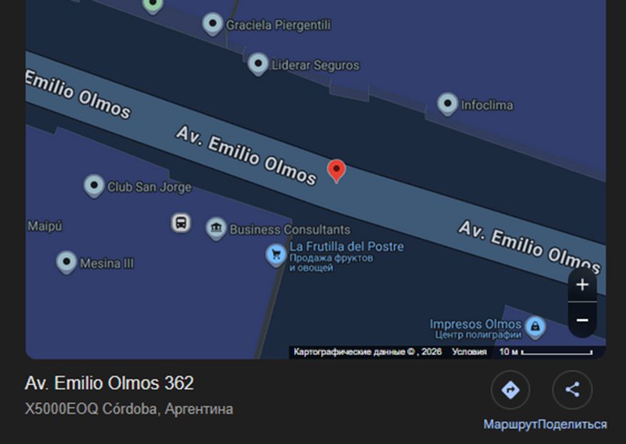 Указанный адрес офиса брокера фейковый. Проверка показала, что в Кордобе на авеню Эмилио Олмос, 362 нет такой компании.