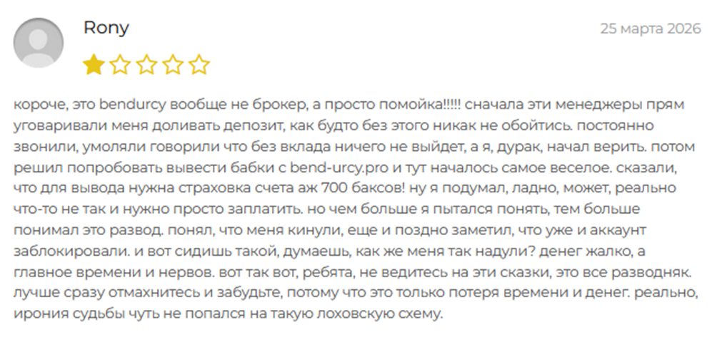 На внешних источниках можно найти множество отзывов о работе площадки Bend Urcy Pro. Но все комментарии негативные, пострадавшие клиенты обвиняют брокера в скаме и вымогательстве.