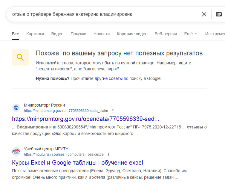 Помимо этого, у девушки есть еще 7 дополнительных видов работ, которые она может осуществлять. На просторах интернета о данной личности информации никакой нет. Отзывы в адрес трейдера Бережная Екатерина Владимировна тоже отсутствуют.