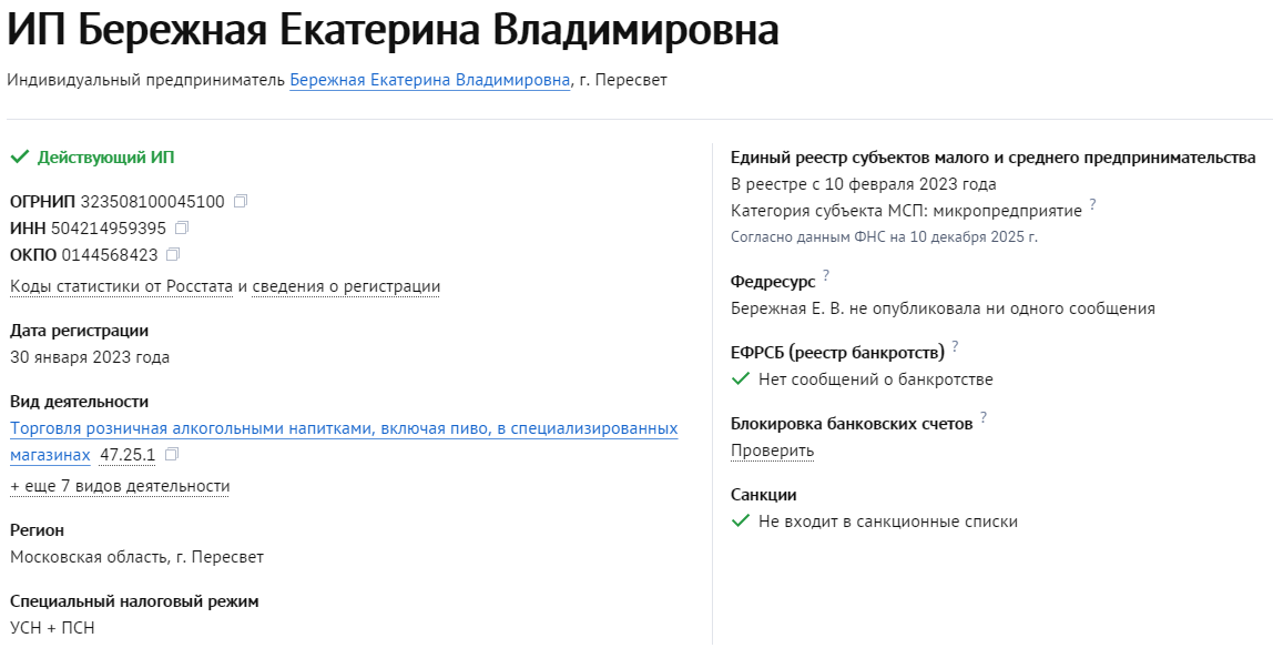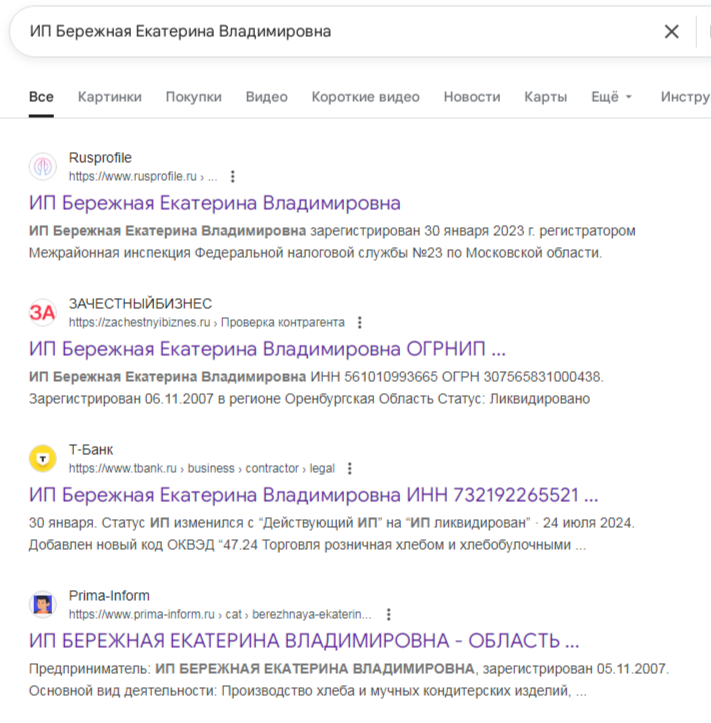 На просторах сети о данном персонаже информации нет. Имя девушки не засветилось ни в одной статье. Нам были доступны только ее юридические данные, по которым она оформилась как индивидуальный предприниматель.