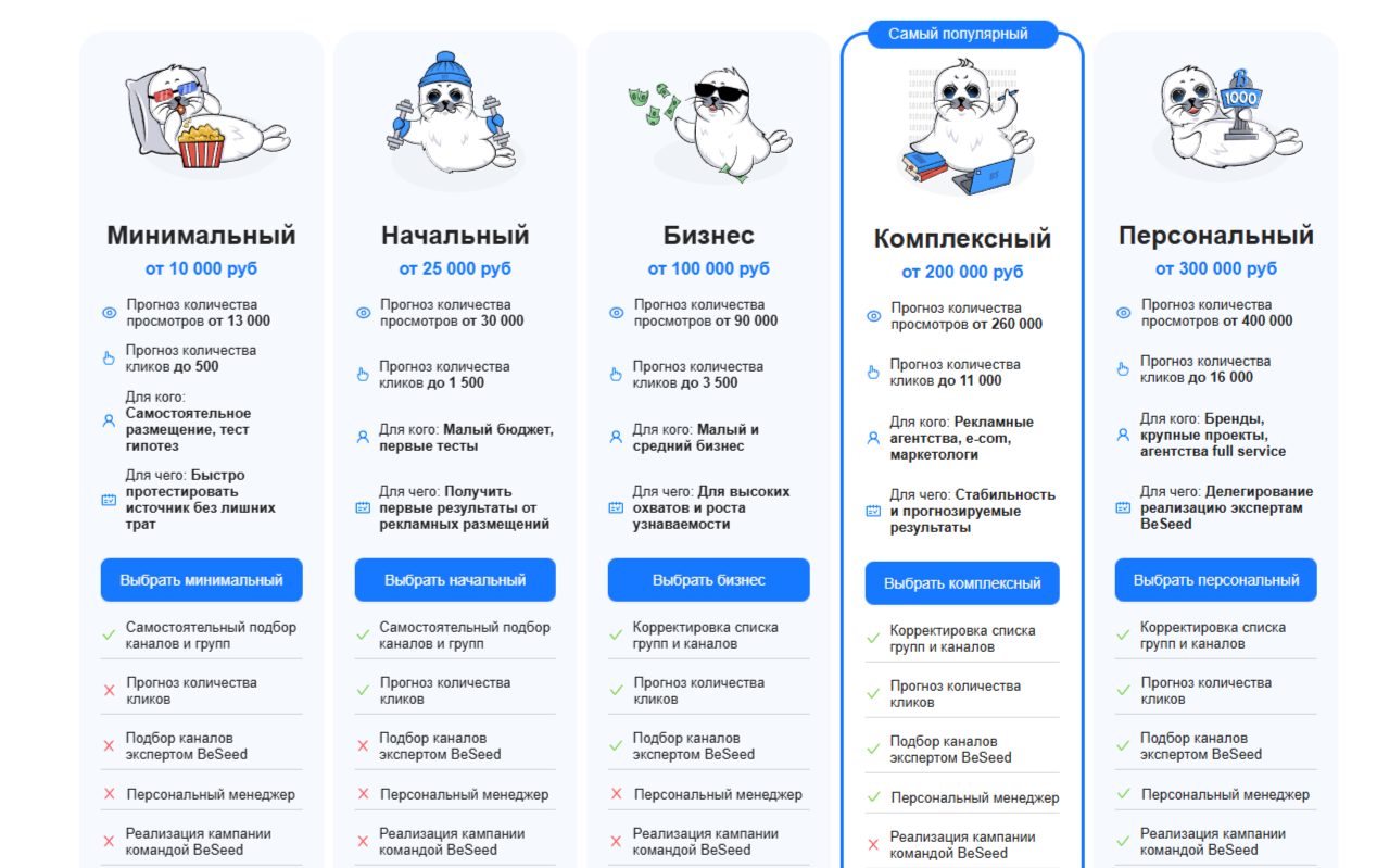 Маркетплейс «Би Сид» предоставляет целевой аудитории лишь одну бесплатную услугу – консультация по выбору тарифа. Рекламные кампании он запускает на платной основе. Своим клиентам платформа предлагает 5 тарифных планов на выбор: