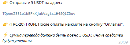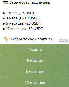 При выборе криптовалюты стоимость месячного использования сервиса – 5 USDT, за год – 30 USDT.