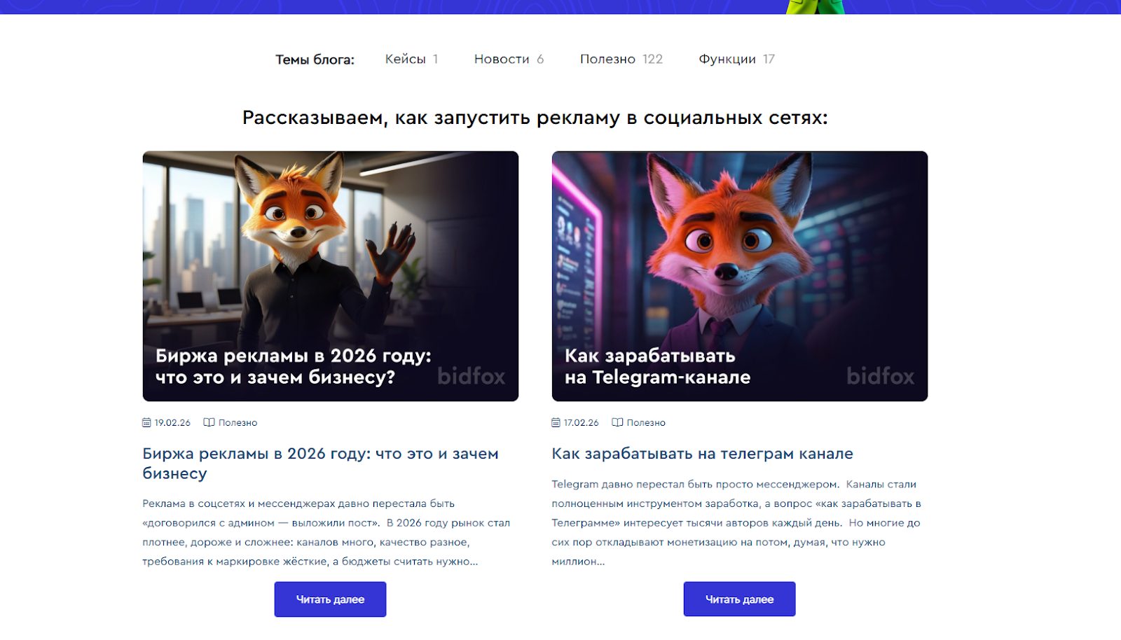 У создателей рекламной биржи есть портал blog.bidfox ru. Здесь можно найти информацию о запуске рекламы в соцсетях, советы как зарабатывать в Телеграме и еще 120 рекомендаций. Последняя публикация данного веб-сайта датирована 2024 годом. Уже более года работа рекламно-информационного проекта поставлена на паузу.