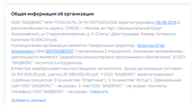 В процессе проверки портала bidfox ru нами выявлены следующие детали. Домен был зарегистрирован 01 марта 2016 года. ООО «Бидфокс» официально появилось на свет 08 июля 2016 года. О бирже рекламы пользователи знают практически 10 лет. Все это время компанией, ставшей создателем проекта, руководит Бородин Егор Алексеевич. Его компания не числится в реестре недобросовестных поставщиков. Правда иногда по официальным данным зарабатывает меньше, чем тратит. Да и уставной капитал организации за упомянутое десятилетие не увеличился со стартовых 10 000 рублей.
