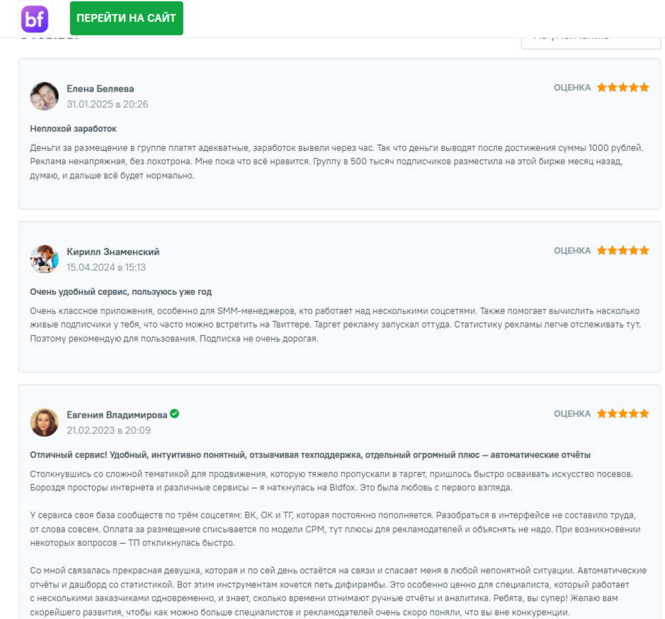 За долгое время существования биржа рекламы получила приличное число позитивных комментариев. В положительных отзывах о сайте bidfox ru пользователи отмечают хорошее приложение, удобство, автоматические отчеты, отзывчивость техподдержки и т. д.