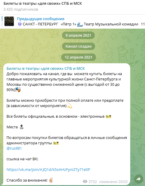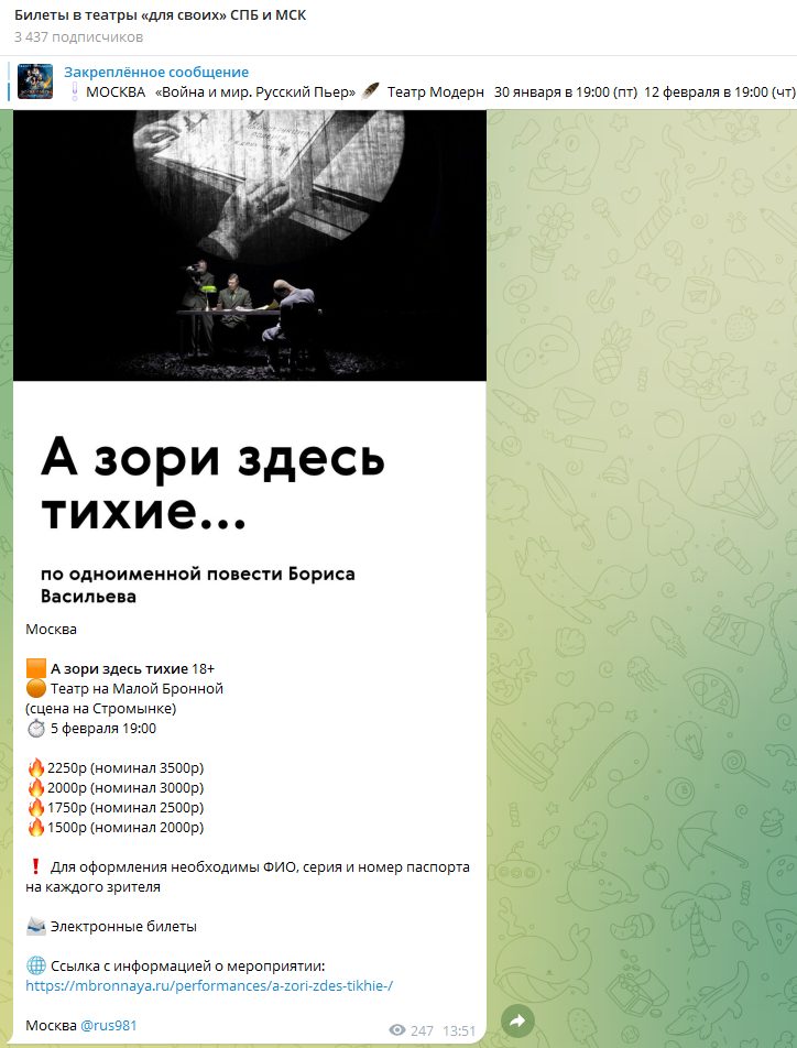 Что известно о телеграмм-канале «Билеты в театры «для своих» СПБ и МСК»