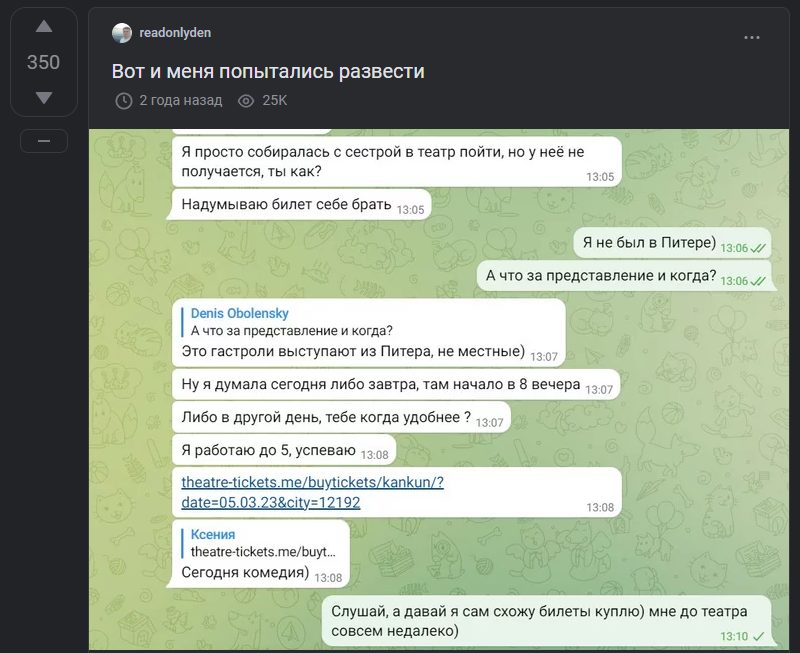 О проекте «Театр для своих Билеты» в «Телеграмм» отзывы практически не найти на просторах интернета, несмотря на приличное количество подписчиков в телеграмм-канале. В рамках этого сообщества предлагают купить билеты на культурные мероприятия Москвы и Санкт-Петербурга со скидкой до 80%, что однозначно выглядит заманчиво, но может оказаться разводом.