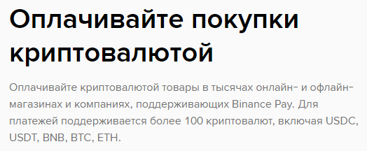 На проекте Binance Pay юзерам доступно более 100 наименований crypto, список включает стейблкоины, «Бинанс коины», «Эфир», «Биткоин» и многие другие популярные монеты.