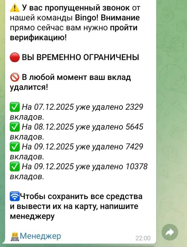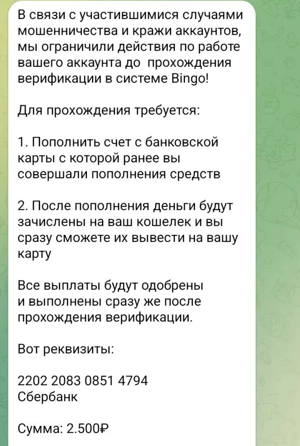 Часто отзывы про заработок и инвестиции на Bingo в Телеграмме упоминают, что бот намеренно создает иллюзию технического сбоя при выводе средств. Например, вам могут написать: «Выплата не прошла, нужно повторить платеж с той же карты для подтверждения реквизитов». С помощью такого маневра скамеры пытаются заставить жертву заплатить дважды. Люди, попавшись на этот развод, теряют не только первоначальный депозит, но и значительные суммы сверху, пытаясь спасти свои вложения.