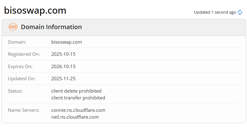 Для начала скажем, что домен сайта bisoswap com был зарегистрирован только в середине октября 2025 года, а его апдейт пришелся на 25 ноября.