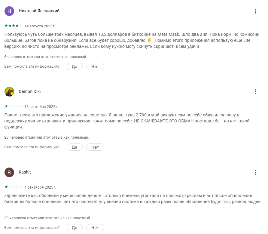 Рейтинг около 3 в Google Play говорит о низком качестве приложения, однако для объективности изучим отзывы о BitTycoon подробнее. В реальность позитивных комментов сложно поверить из-за отсутствия конкретики. Один из пользователей, например, пишет, что вывел 18,5 долларов, но не уточняет, сколько он потратил времени на их заработок и делал ли для этого вложения собственных средств.