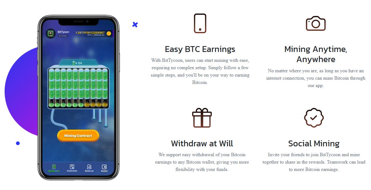 Возможности сервиса кратко описаны на официальном сайте Bit Tycoon Com. На английском языке разработчики пишут про легкий заработок без каких-либо усилий, настроек и вложений. Также здесь написано про простой вывод и возможность увеличения дохода благодаря привлечению к процессу друзей.