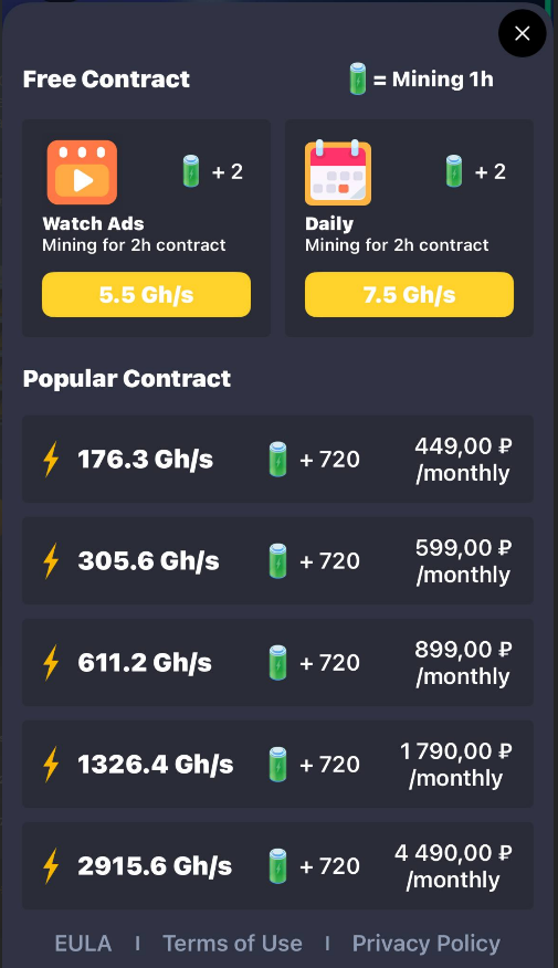 Способов майнить здесь не так уж и много. Бесплатно это позволяют делать ежедневные награды, которые выдают в 0:00, а также просмотры рекламы – ее можно изучать постоянно до полного заполнения емкостей. Интересно, что при получении 24-часового бонуса перед пользователем все равно открывается ролик без возможности его пропустить.