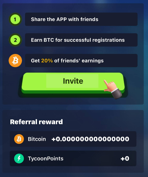 Реферальная система позволяет выйти на пассивный заработок, ведь с каждого друга программа обещает по 20% от его наград как в Биткоине, так и в TycoonPoints. Игровая валюта кажется довольно бесполезной: ни одного применения в геймплее ей мы не нашли. Разработчики пишут про будущий листинг монеты на биржах, но в это верится с трудом, т.к. даже приблизительных дат разработчики не называют.