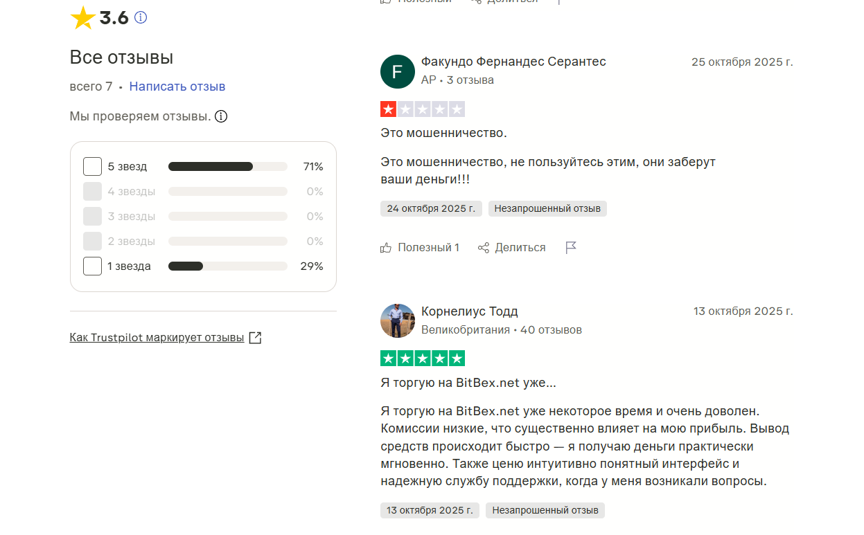 При открытии сайта BitBex net видно данные про 436 отзывов на TrustPilot и высший балл в пять звезд, но анализ показал, что данные отличаются, причем есть и отрицательные комментарии. Один из пользователей не раскрывает подробностей, но утверждает, что проект принадлежит мошенникам, а также предостерегает остальных от сотрудничества с биржей, так как это может привести к потере средств.