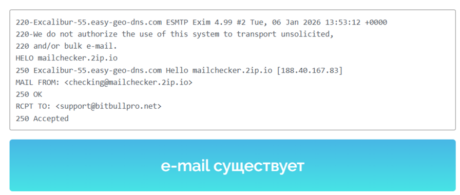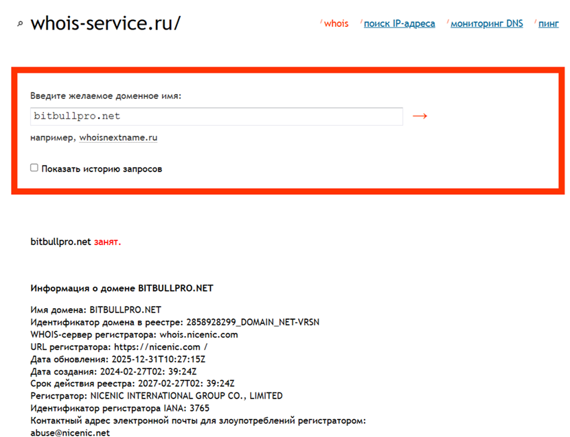 Домен площадки зарегистрирован в 2024 году, но только в 2025 он перешел к Bitbullpro Net. Небольшой срок работы площадки – подозрительный признак, поэтому сервис нельзя назвать надежным и опытным. Согласно данным с сайта Whois-service, доменный адрес продлен до 27.02.2027 г.