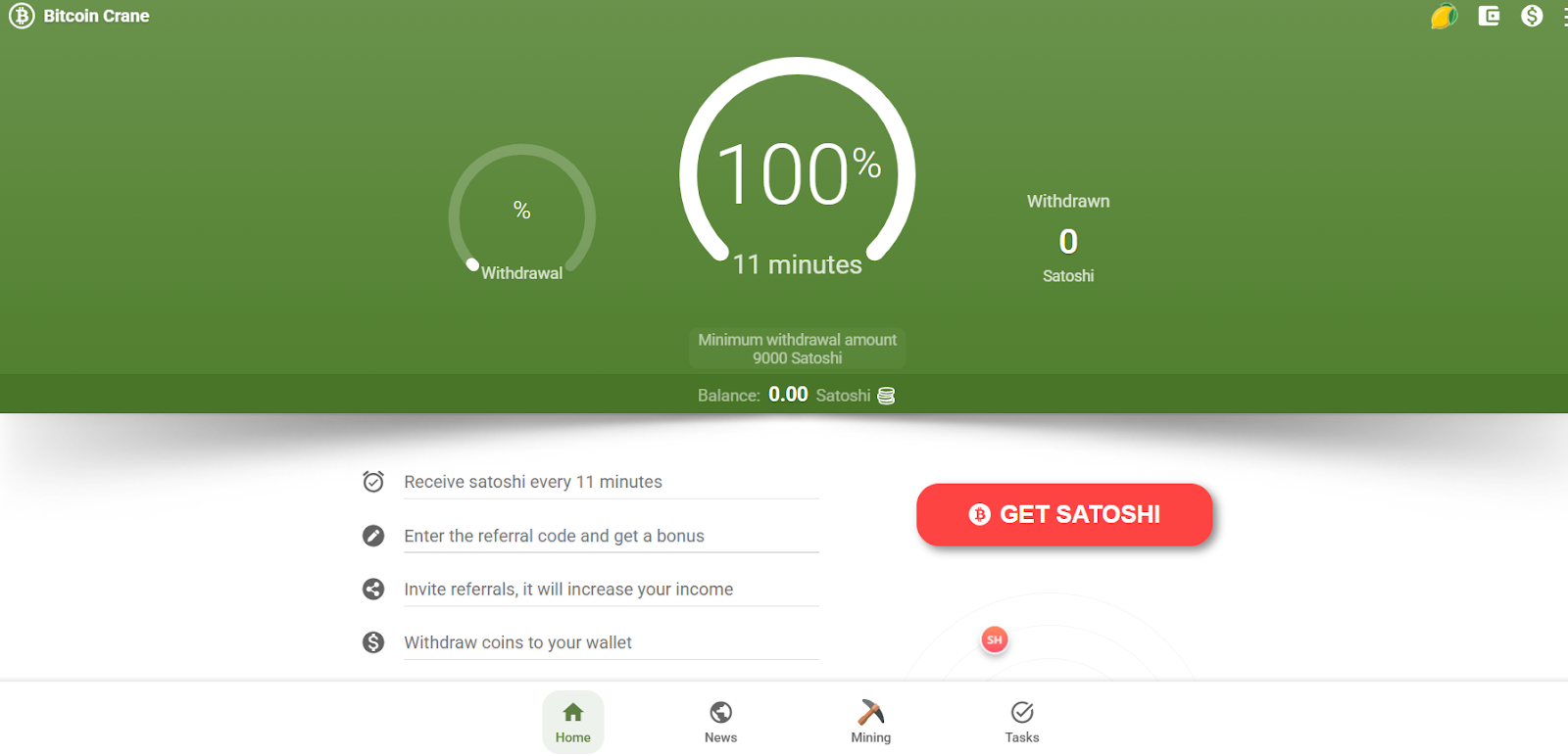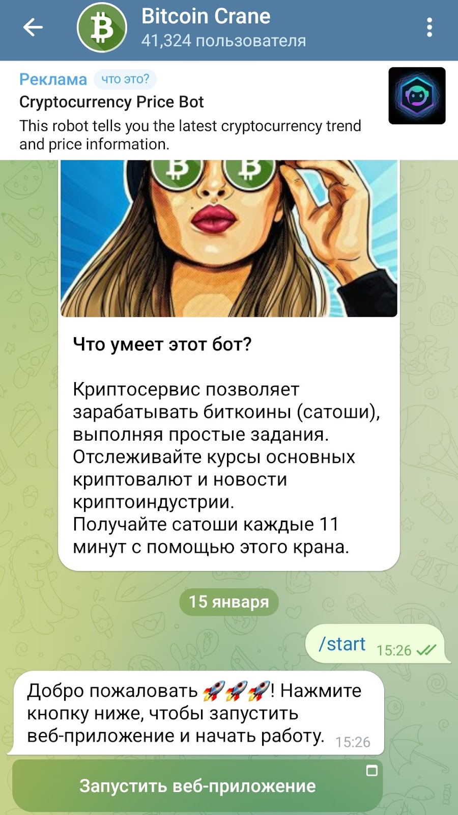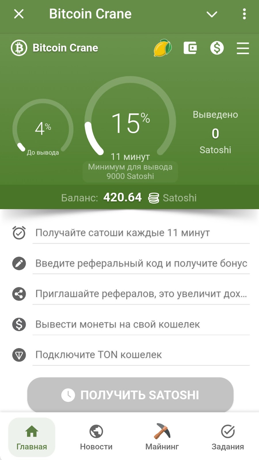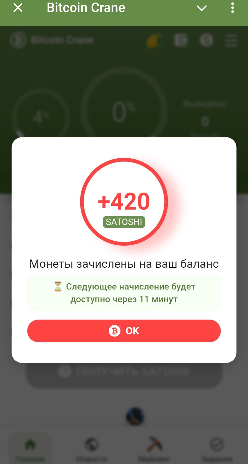 Для начала заработка сатоши нужно перейти в тг бота BitcoinCrane bot и активировать его. Предложат запустить веб-приложение. При переходе сразу появится возможность забрать 420 сатоши. Далее нужно просмотреть короткую рекламу продолжительностью 9 секунд. Для следующего начисления надо ждать 11 минут.